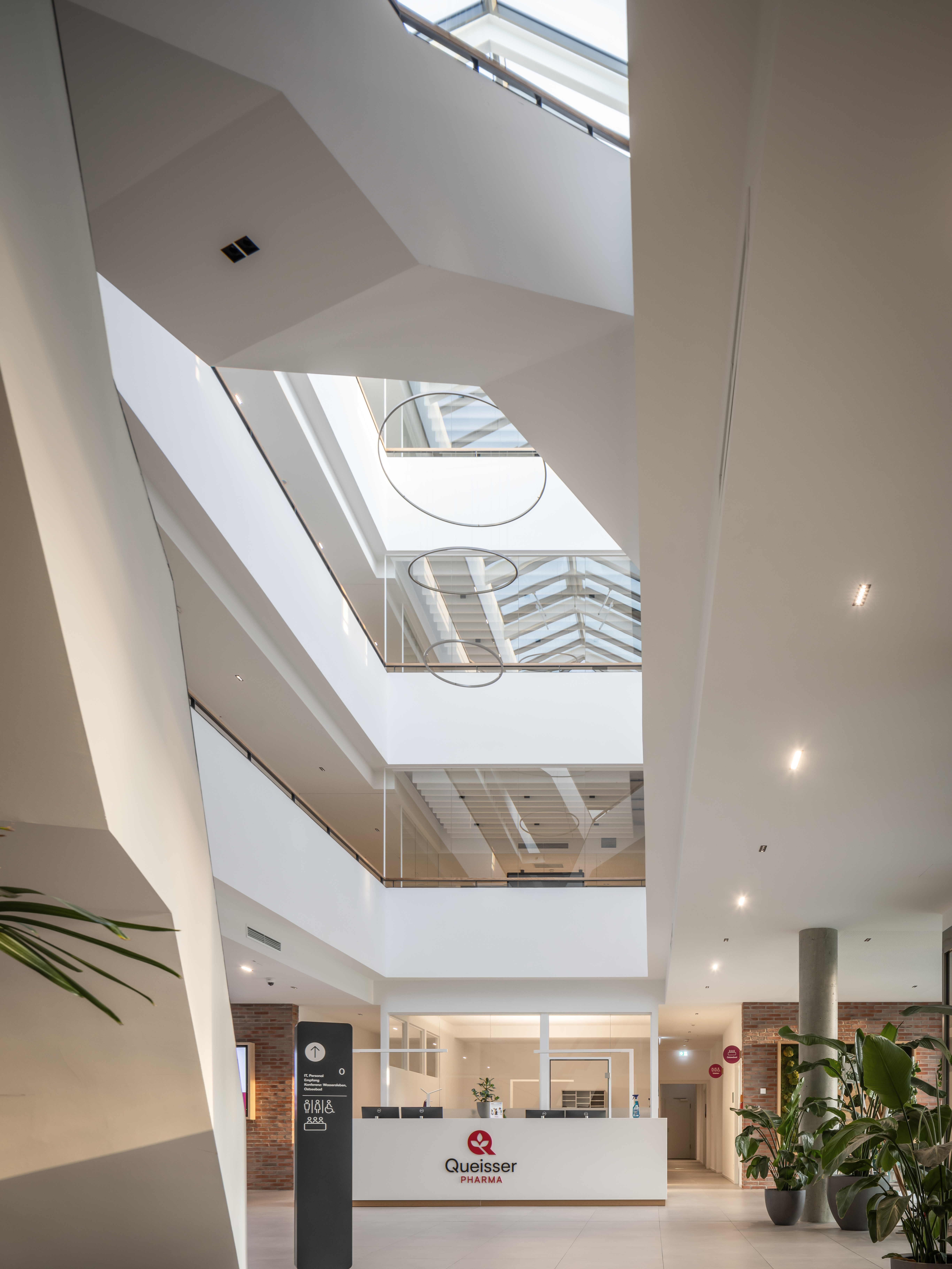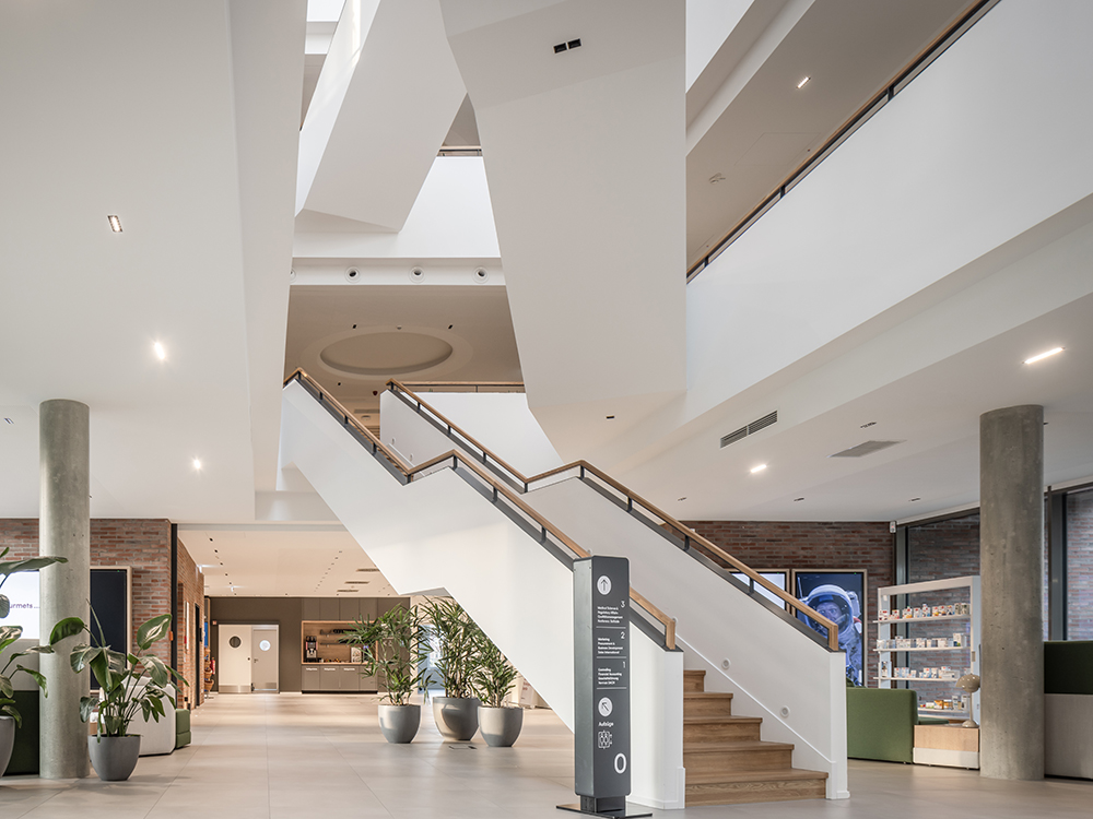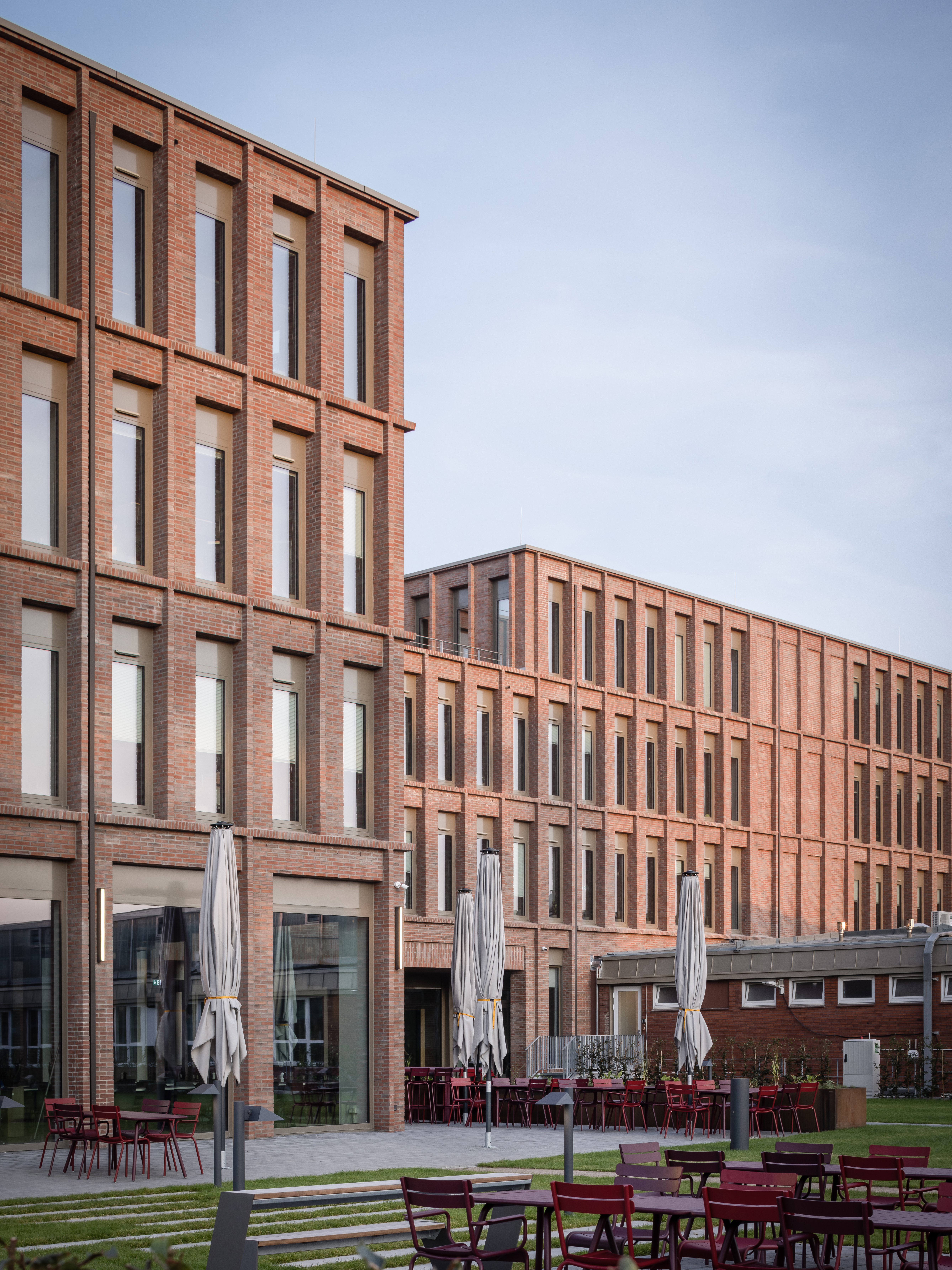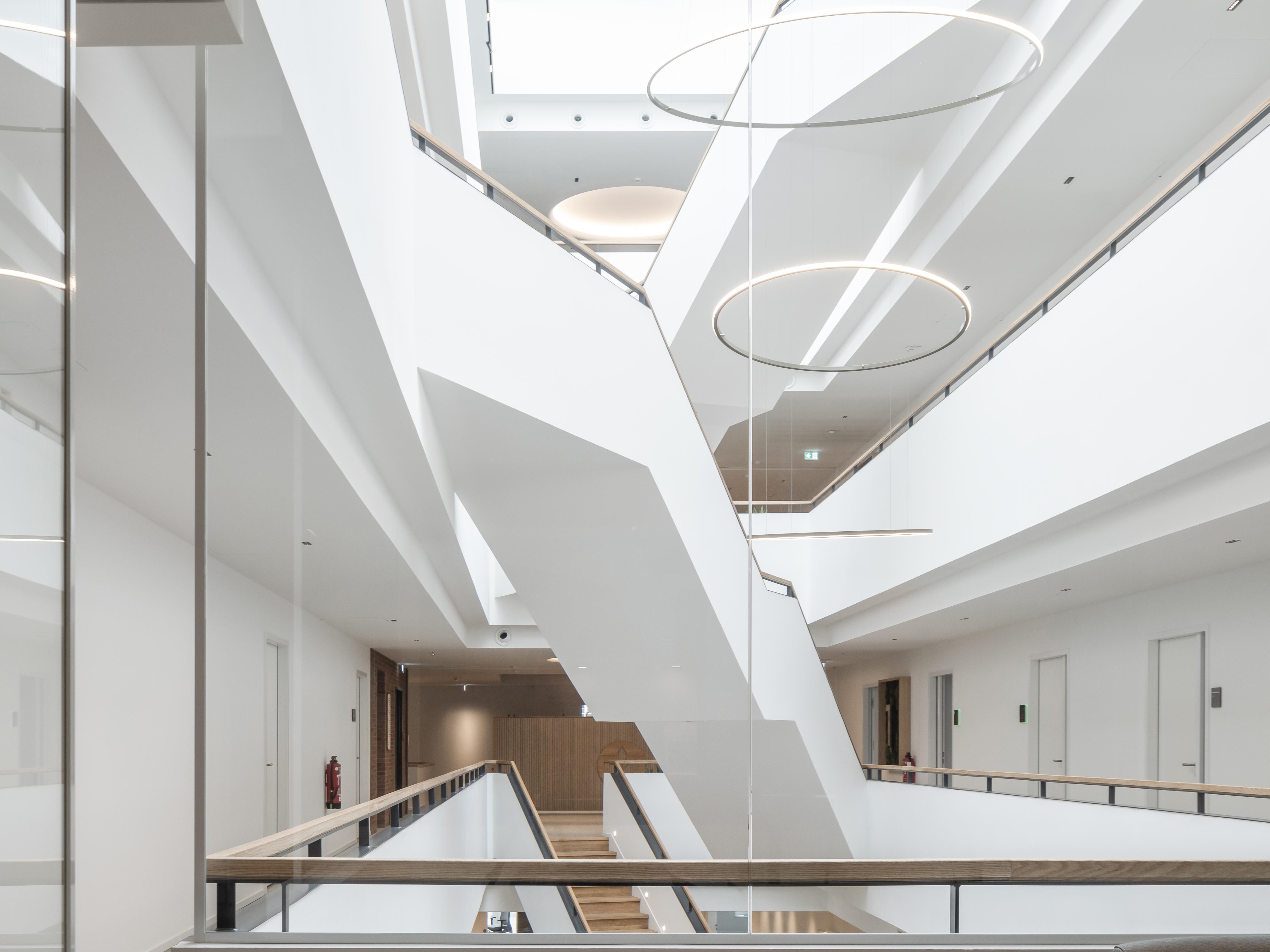 Im Dialog mit den Nutzern wurde für das weitere Wachstum des Unternehmens ein Campuskonzept entwickelt, das durch den aktuellen Neubau begründet wird. In der neuen Hauptverwaltung bildet ein geschossübergreifendes Atrium eine neue Mitte, um die herum sich die offenen Meetingräume und Gemeinschaftsflächen anordnen. In seiner Materialität und Ausprägung orientiert sich das Gebäude an den historischen Speichern am Flensburger Hafen und bildet so einen selbstverständlichen Stadteingang.