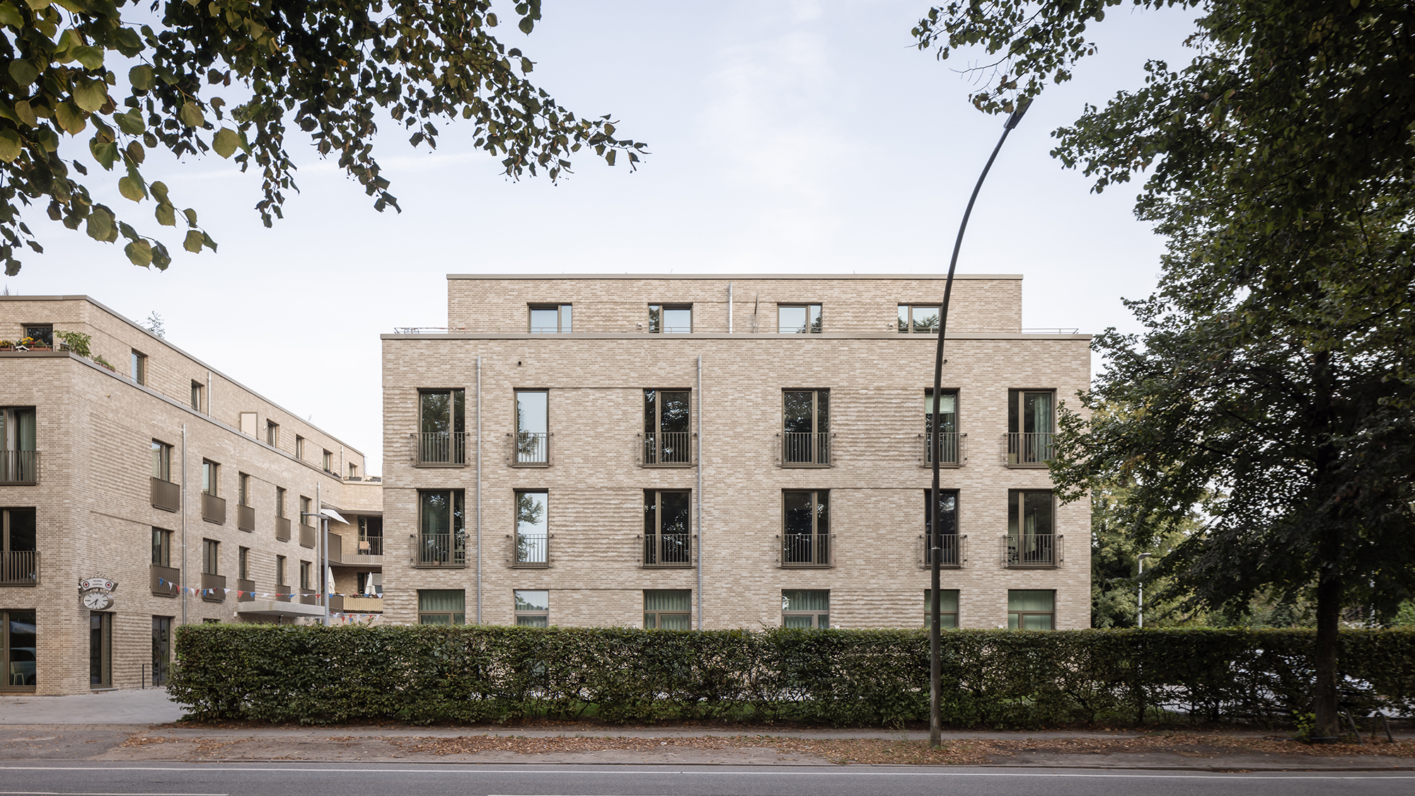 Die helle Klinkerfassade bildet den Auftakt für den Stadtausgang im Norden Hamburgs an der Bebelallee.
